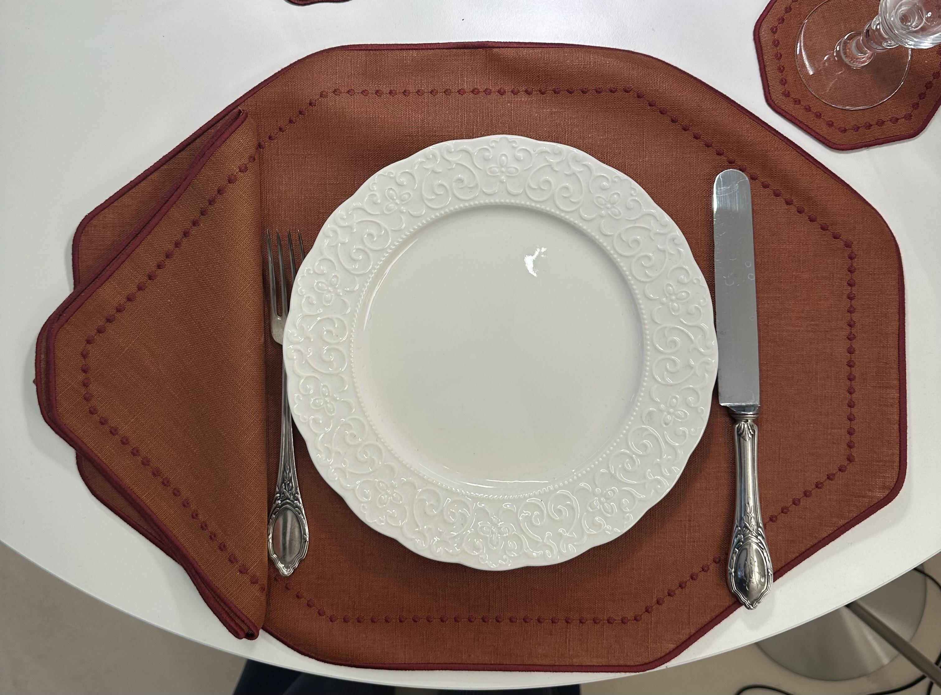 Crafted from 100% stain-resistant linen, the Galassia placemat is practical and durable, yet retains all the charm of natural fabric. Wide and harmonious, it gracefully accommodates plates, cutlery, and glasses, creating a table setting that feels both curated and modern.